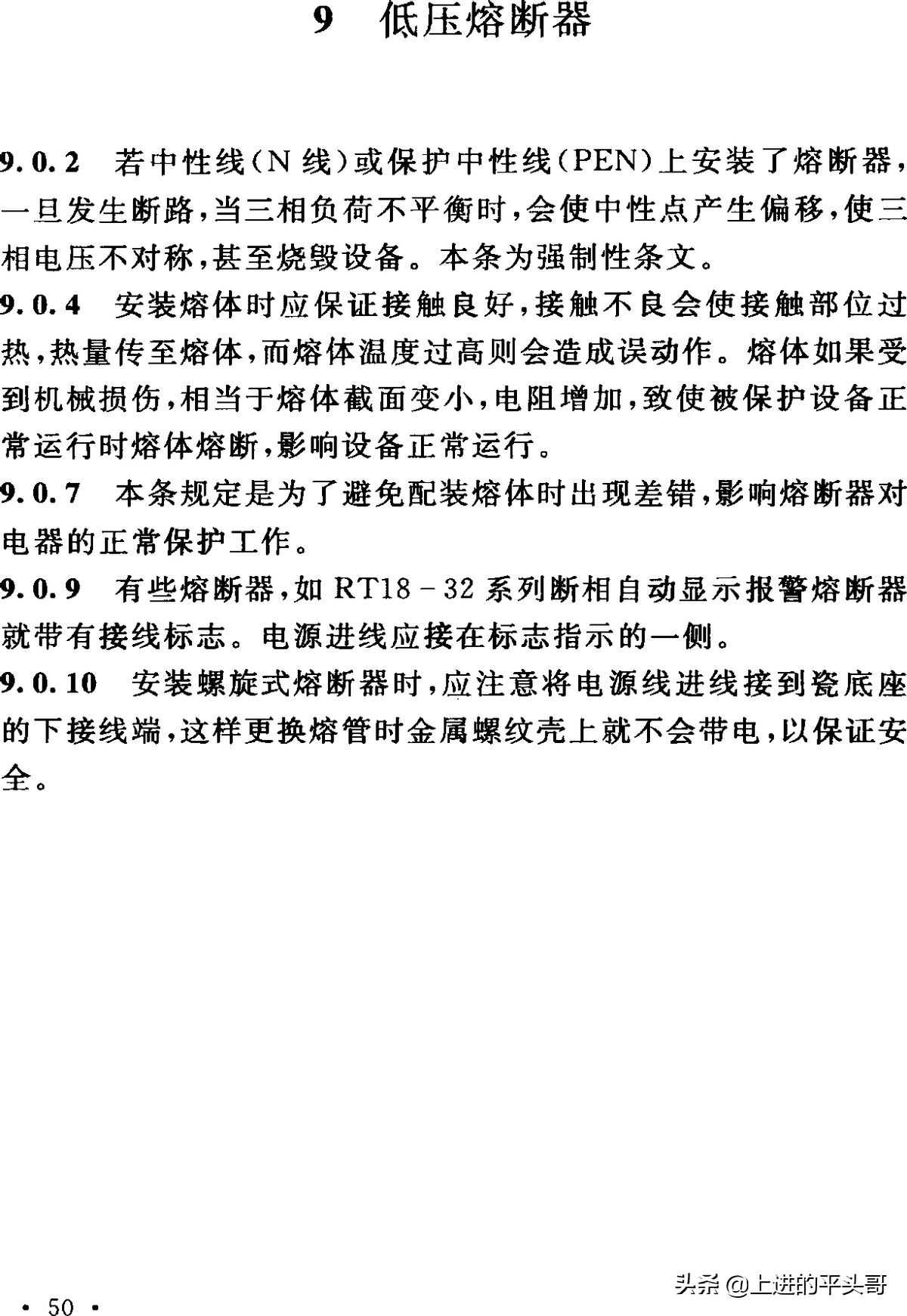 9 . 0 . 2 若中性线(N 线)或保护中性线(P E N ) 上安装了熔断器,一旦发生断路,当三相负荷不平衡时,会使中性点产生偏移,使三相电压不对称,甚至烧毁设备。本条为强制性条文。