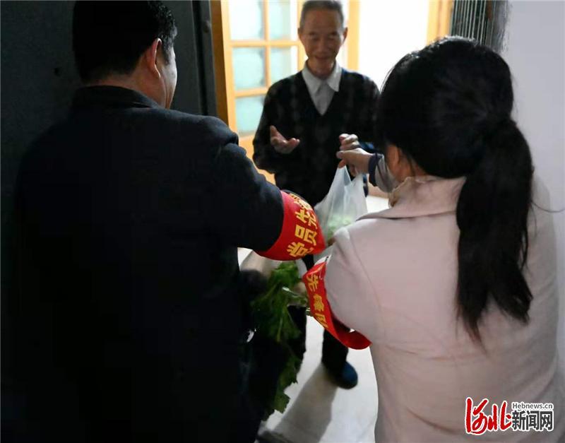 邯郸市邯山区百乐苑社区拥军联盟成员单位和志愿者为社区高龄退役军人送蔬菜。通讯员李金花 摄