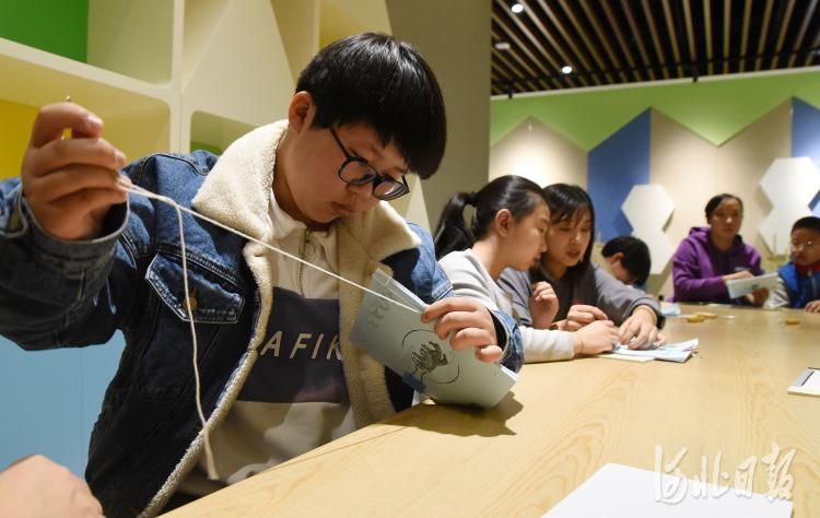 2021年1月2日,小朋友在河北省邯郸市博物馆内体验装订线装书。