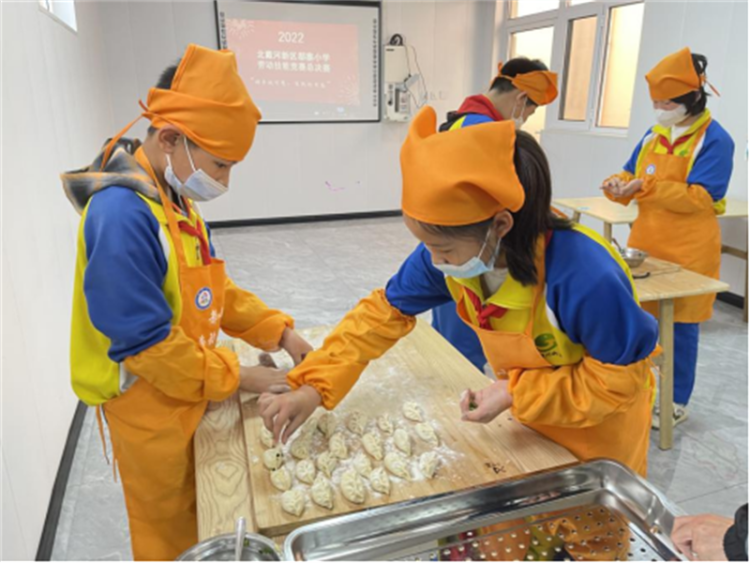 秦皇岛市北戴河新区一所小学开展的活动中,学生们正在包饺子。