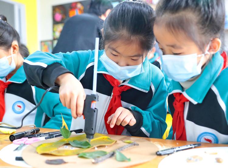 2021年4月27日,秦皇岛市第七中学玉龙湾校区小学部学生在1984文化创意产业园区制作大地艺术创意作品。图片选自视觉中国