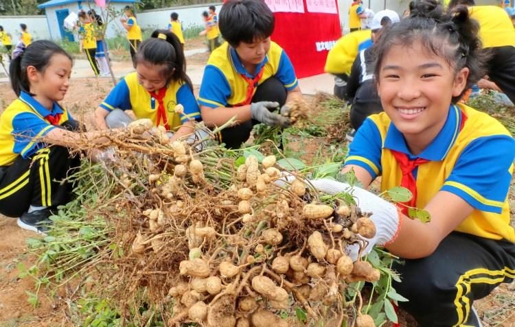 2021年9月18日,秦皇岛市海港区石门寨学区下平山小学学生展示收获的花生。 图/视觉中国