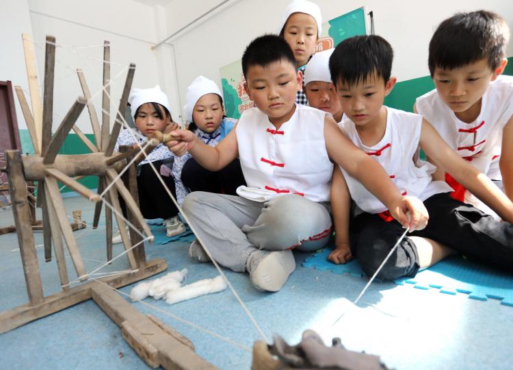 2021年9月11日,临西县第一完全小学卫罗菴分校的劳动研学实践课上,学生们体验传统纺织。河北日报通讯员张玉坤摄