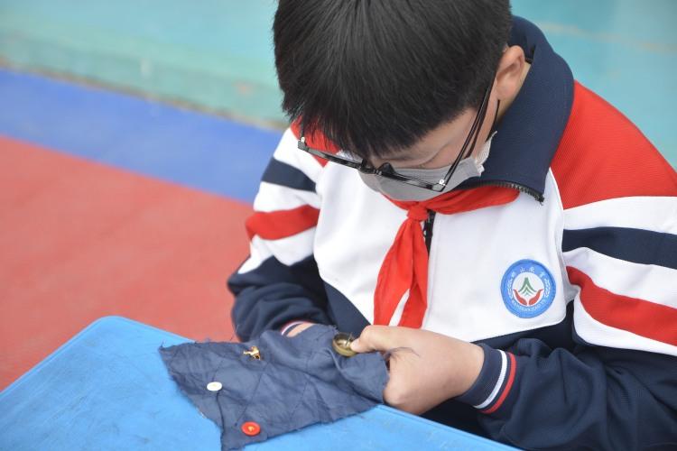 2022年3月30日,邯郸市邯山区张庄桥小学学生在缝扣子。 图/视觉中国