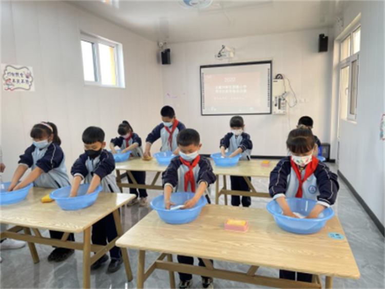 五一前夕,秦皇岛市北戴河新区一所小学内,学生们正在学习洗衣服。