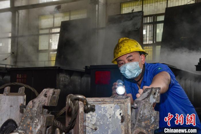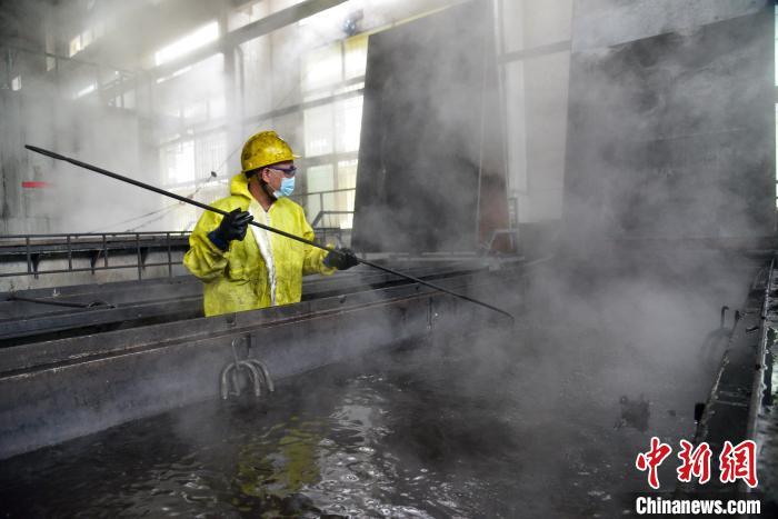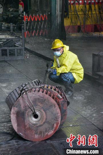 杨俊使用工具检查火碱池中部件污渍的溶解情况。 王以照 摄