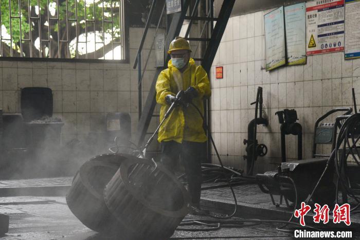 杨俊用高压水枪冲洗火车头上的部件。 王以照 摄