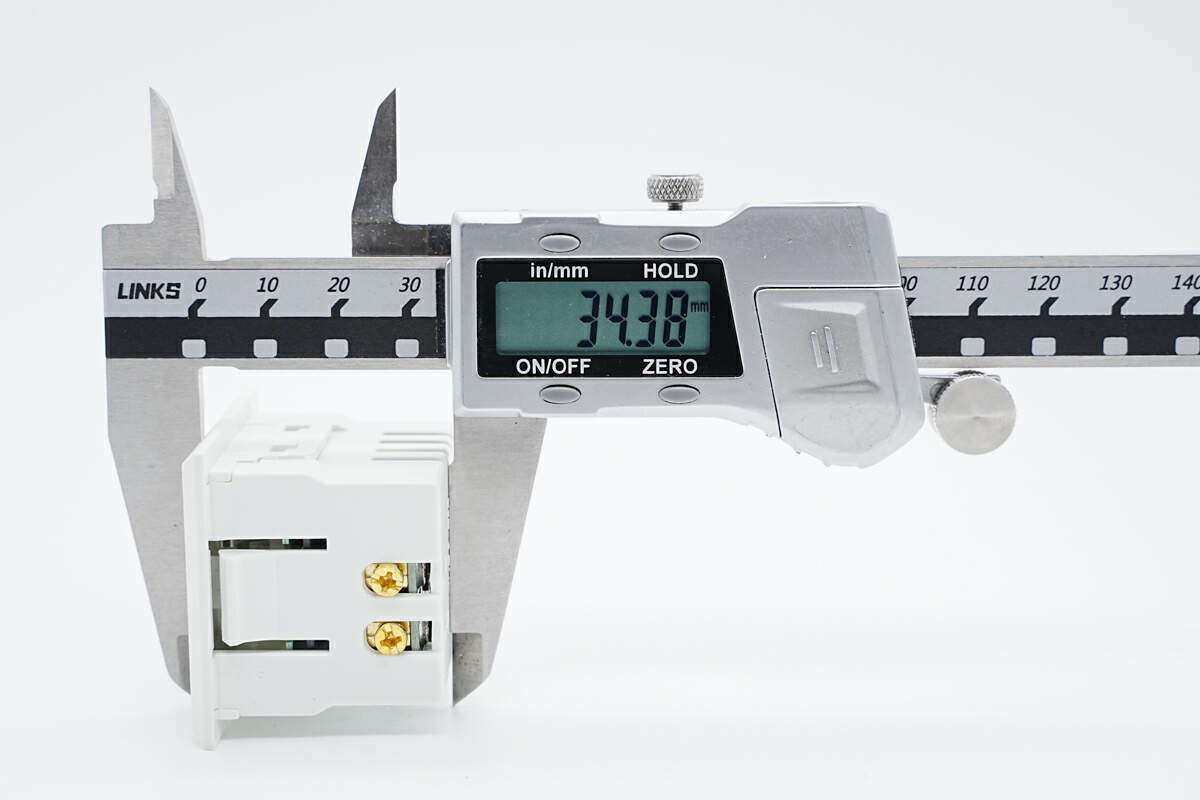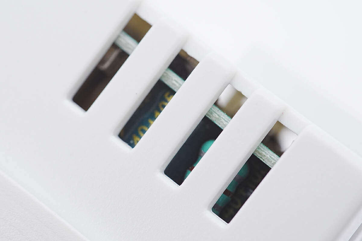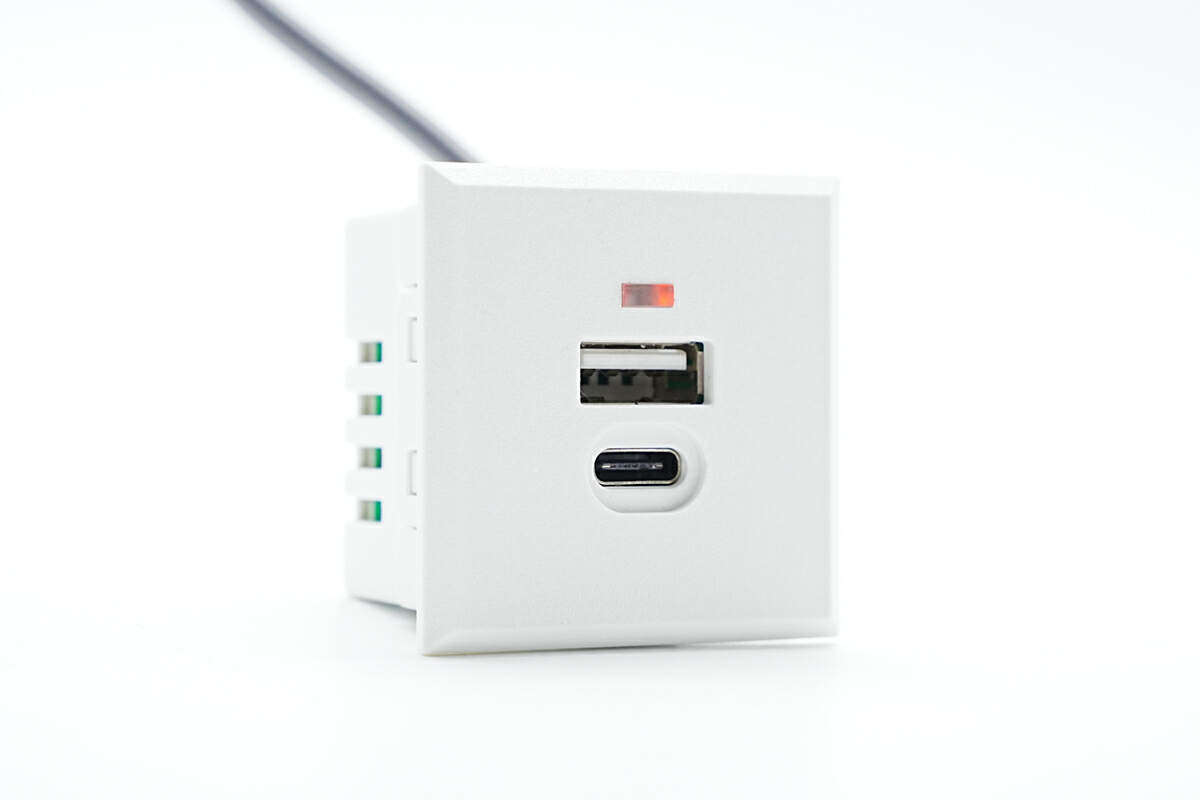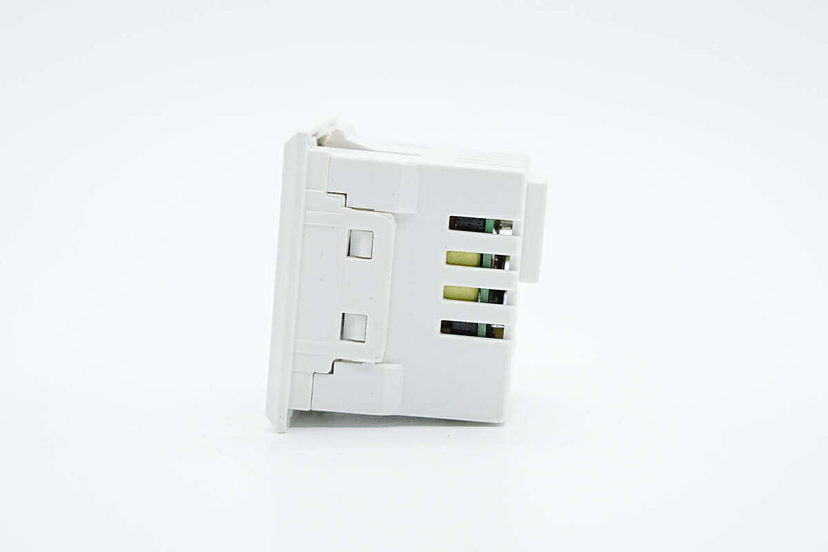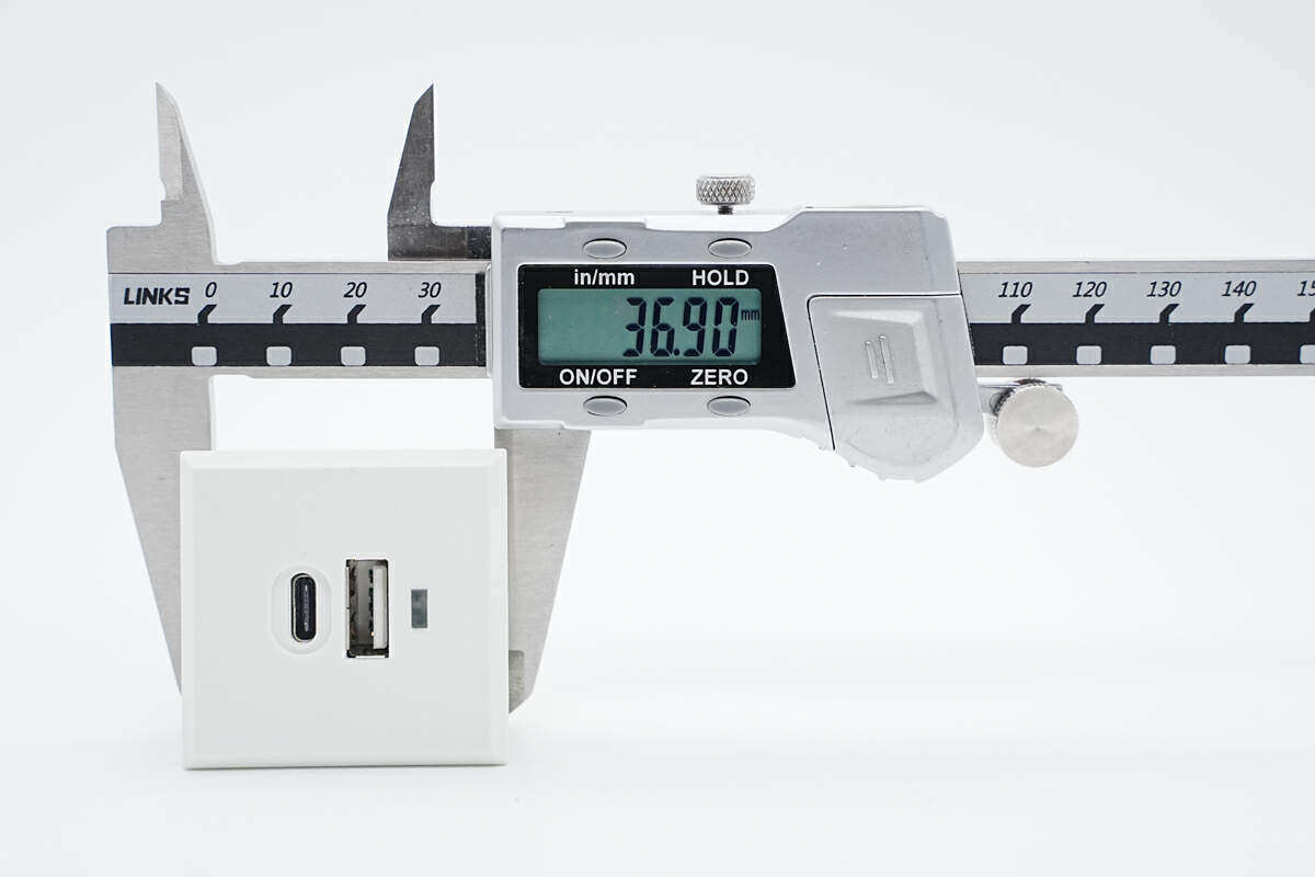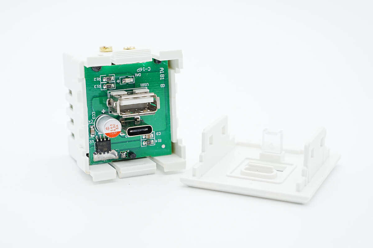 这款USB插座模块采用PC防火材质塑料外壳,表明磨砂抗指纹,顶面边缘倒角处理。