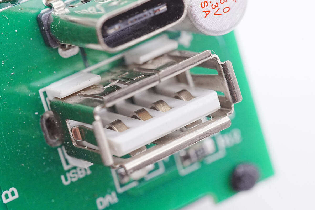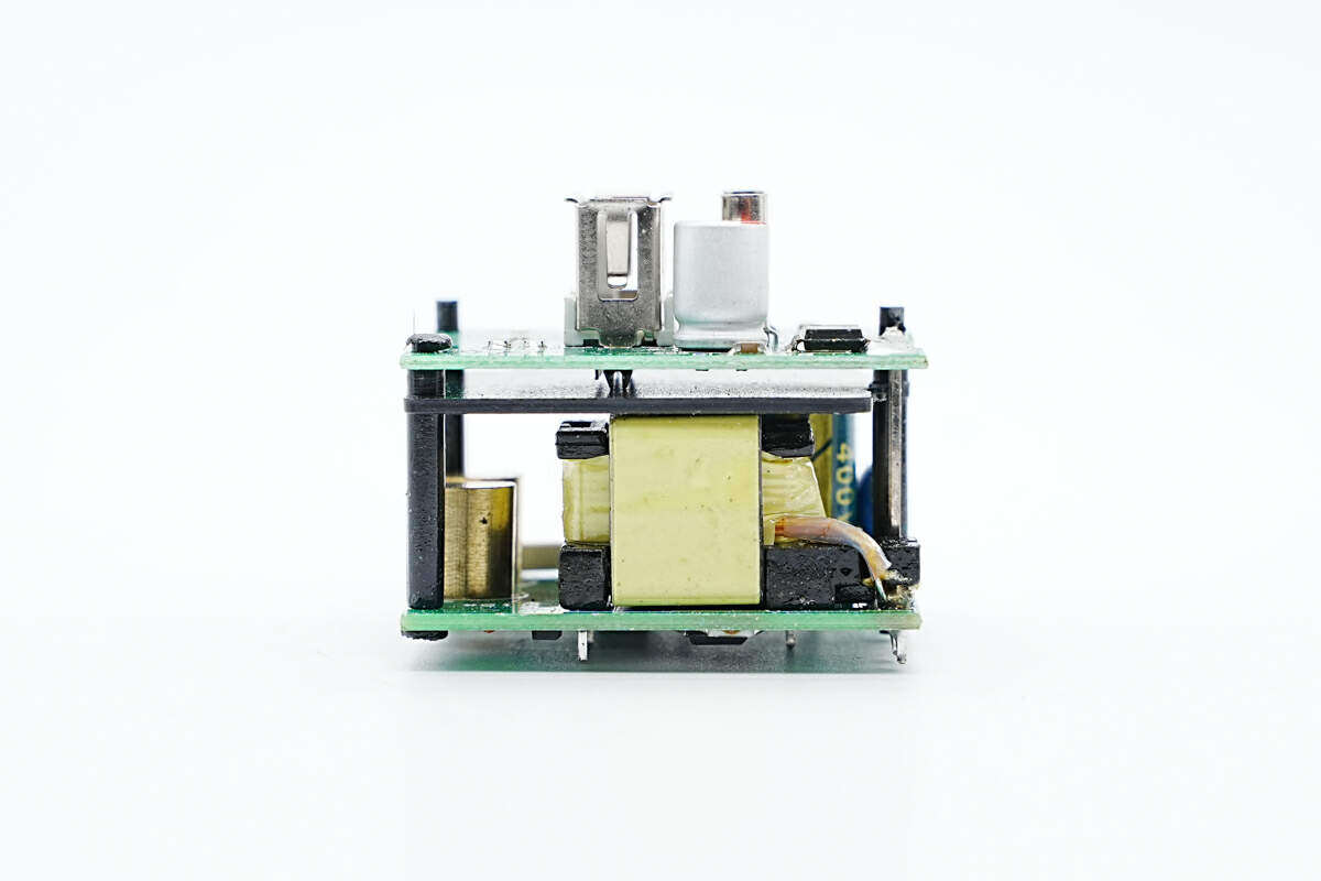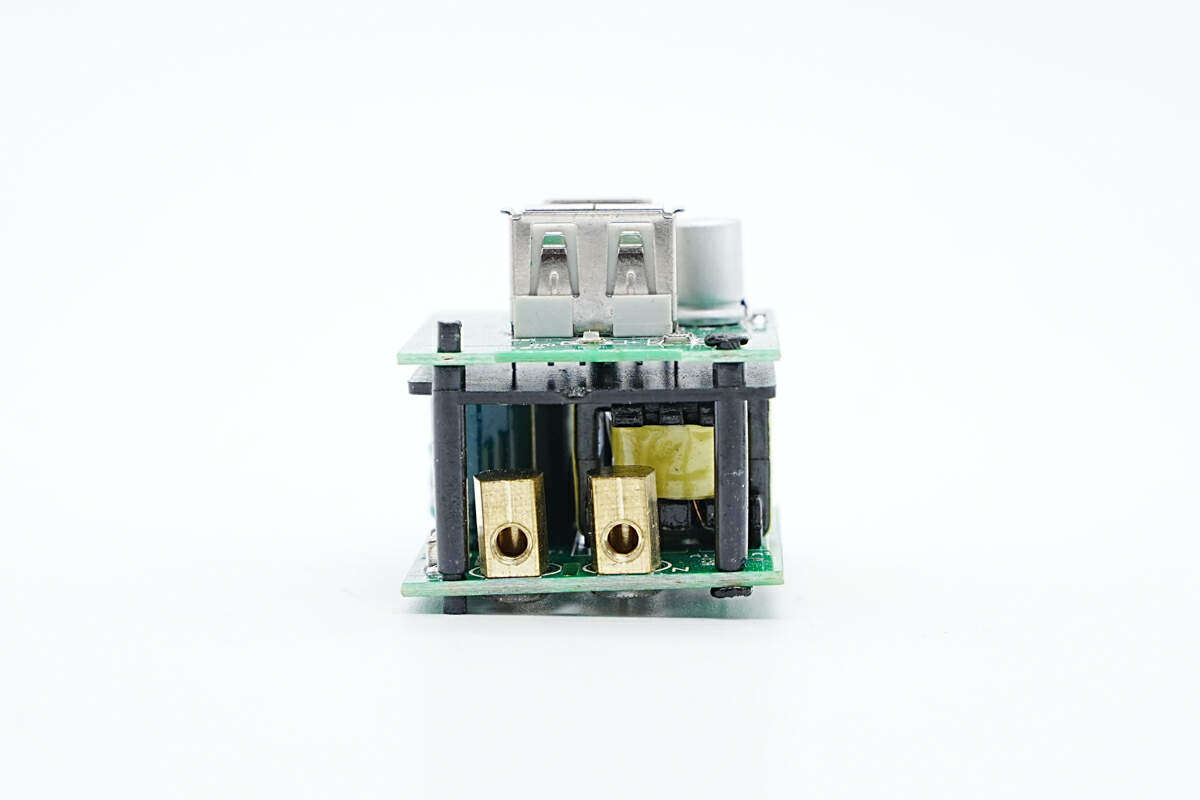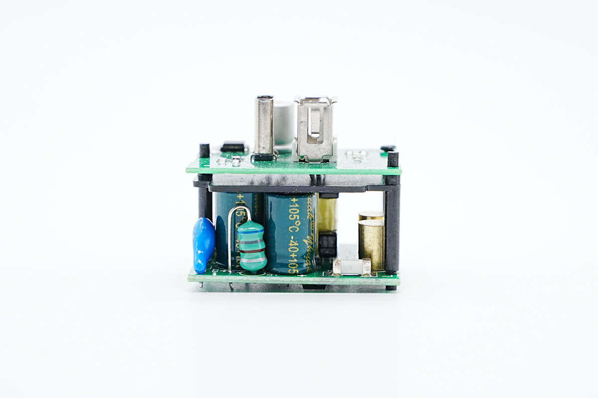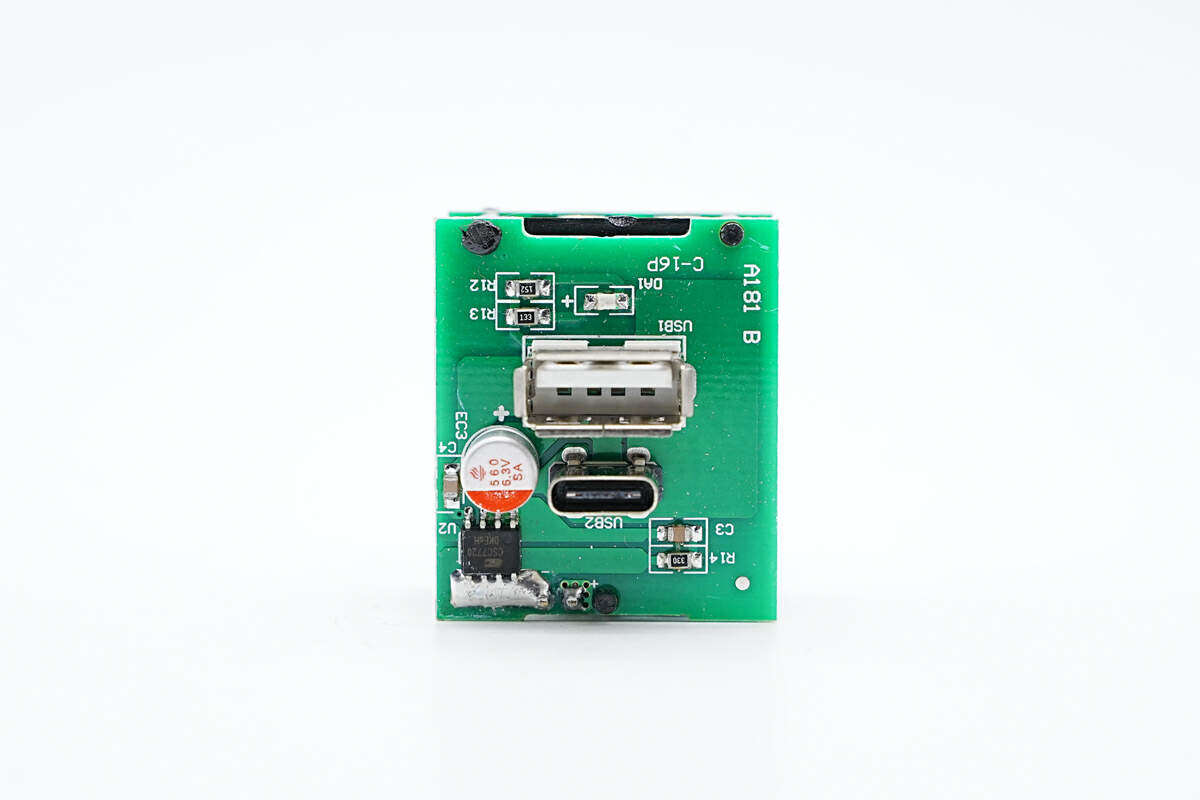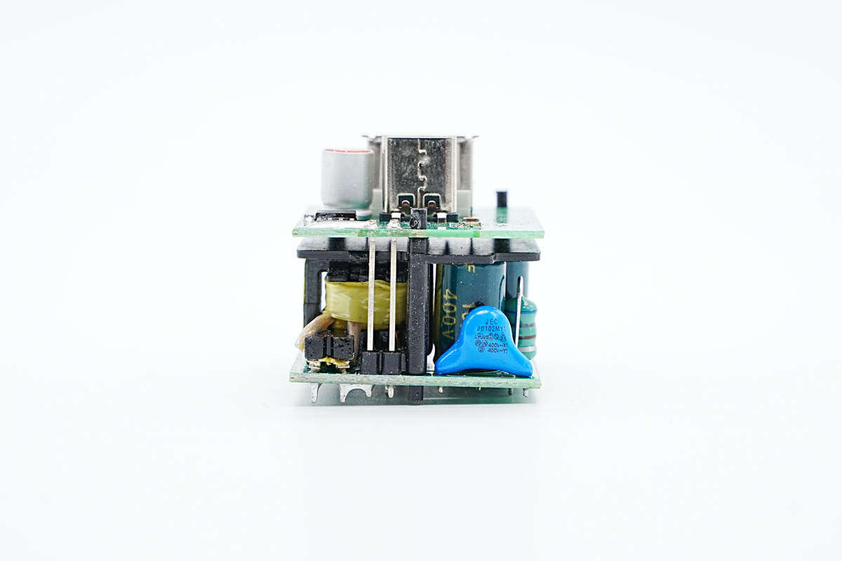 小板正面焊接同步整流芯片,滤波电容,USB-C和USB-A母座以及电源指示灯。