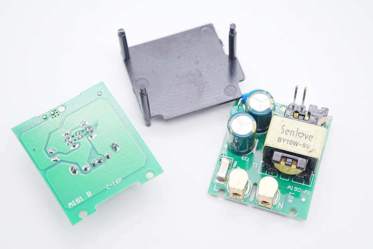 剪断连接两块小板的排针,继续进行拆解。在两块小板中间采用一块塑料支架用于初次级之间隔离。