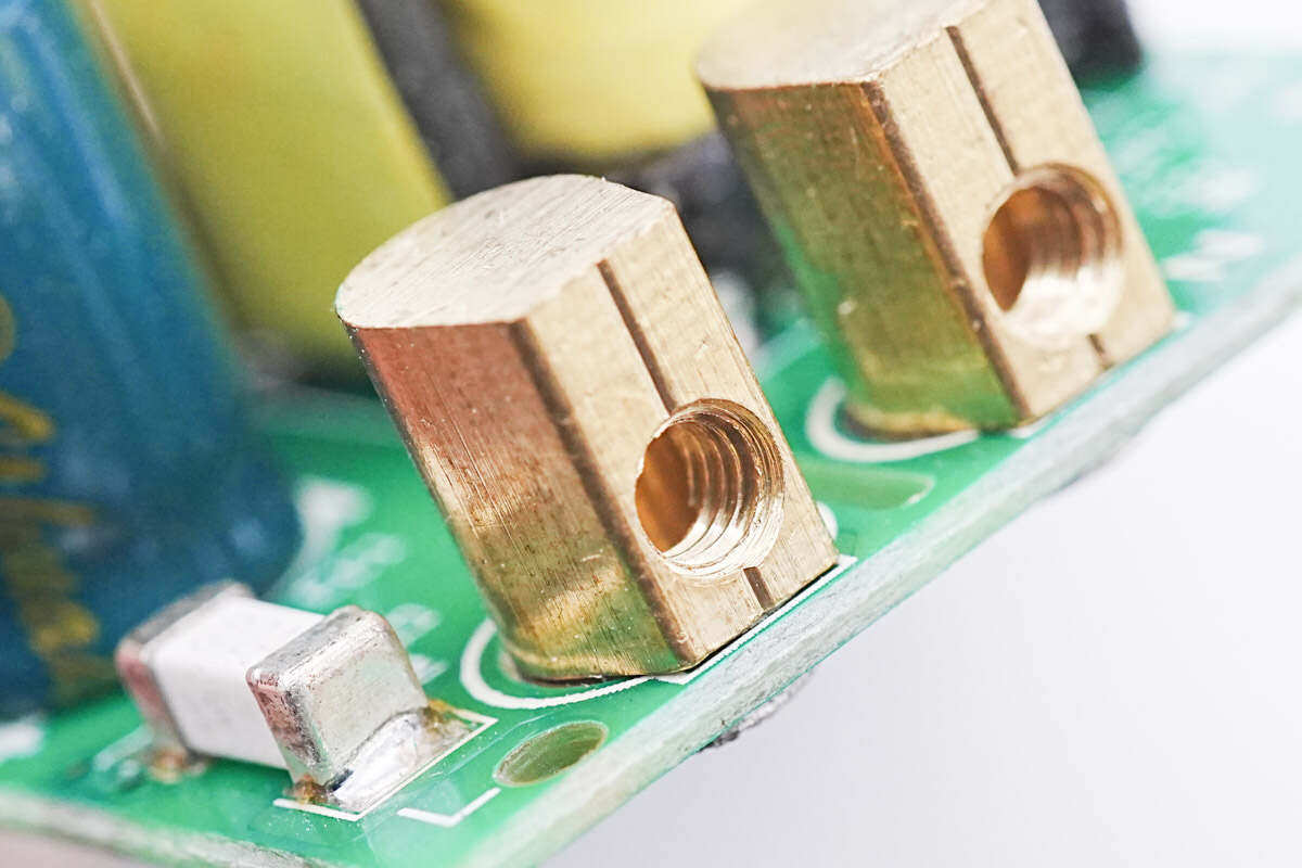 在两块小板之间的空间内部焊接滤波电容和变压器。