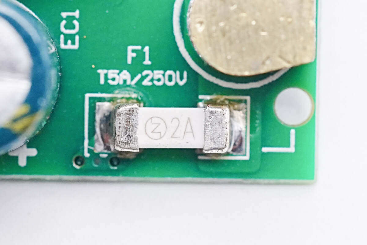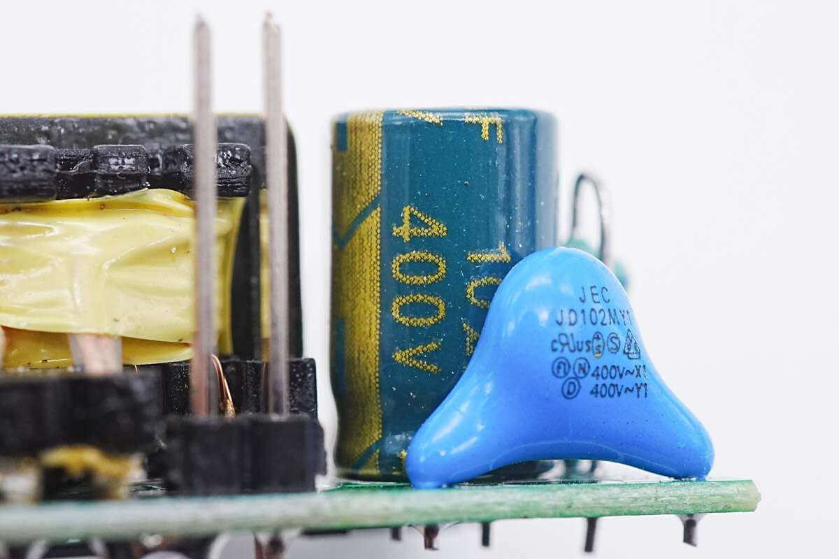 小板正面焊接高压滤波电容,保险丝,变压器和蓝色Y电容。