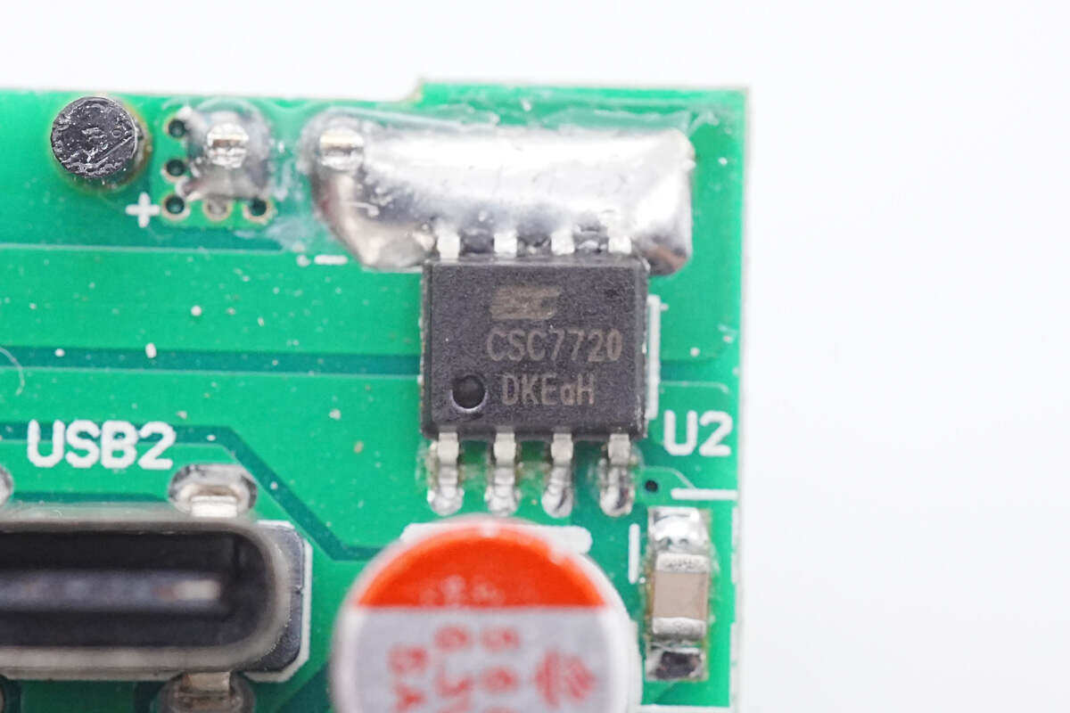 同步整流芯片来自晶源微,型号CSC7720,内部集成45V NMOS,导阻17mΩ,支持DCM和QR工作模式,具备5V2A输出能力。