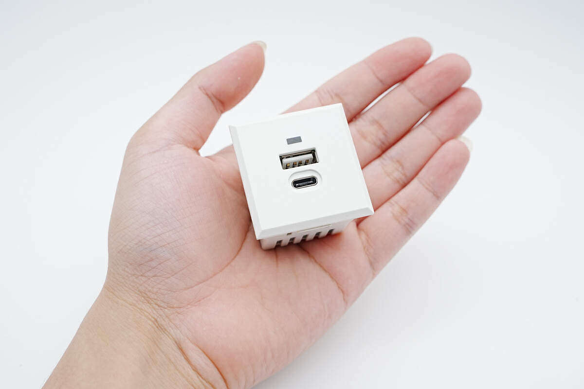 模块截面为正方形,顶部配备1A1C两个USB接口以及指示灯。