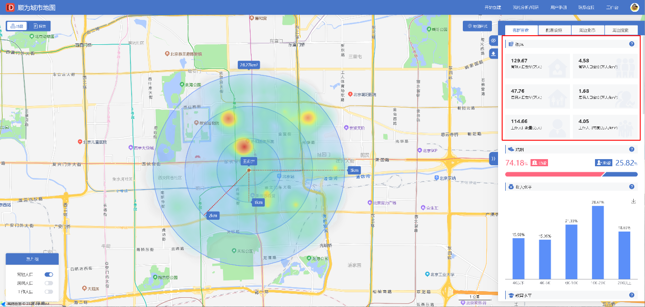 因为市场规模够大,市场前景也是一片大好,门槛又不是特别高,所以目前很多人都想试一下开家手机维修店,开店之前,肯定是要对开店周边的客户群体做一些调研,只有您深入了解了客户了您才可以更好的对您的手机维修店进行定位,大概来说我觉得需要考虑如下指标(以下我所用数据来源是:顺为城市地图http://www.data-dance.com,平台拥有最终解释权):客户画像