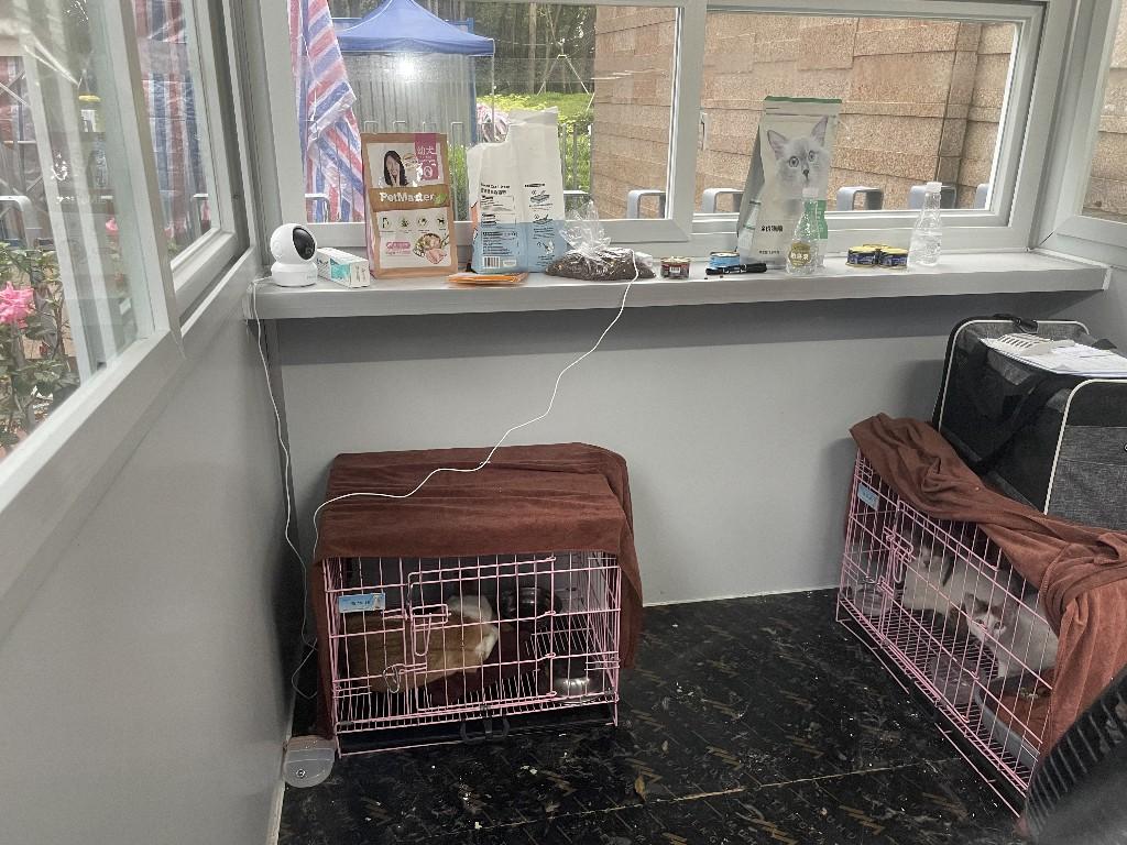 宠物驿站有5个集装箱用来安置猫咪,2个集装箱安置狗狗,还有另外两个岗亭安置需要重点观察或隔离照顾的宠物。