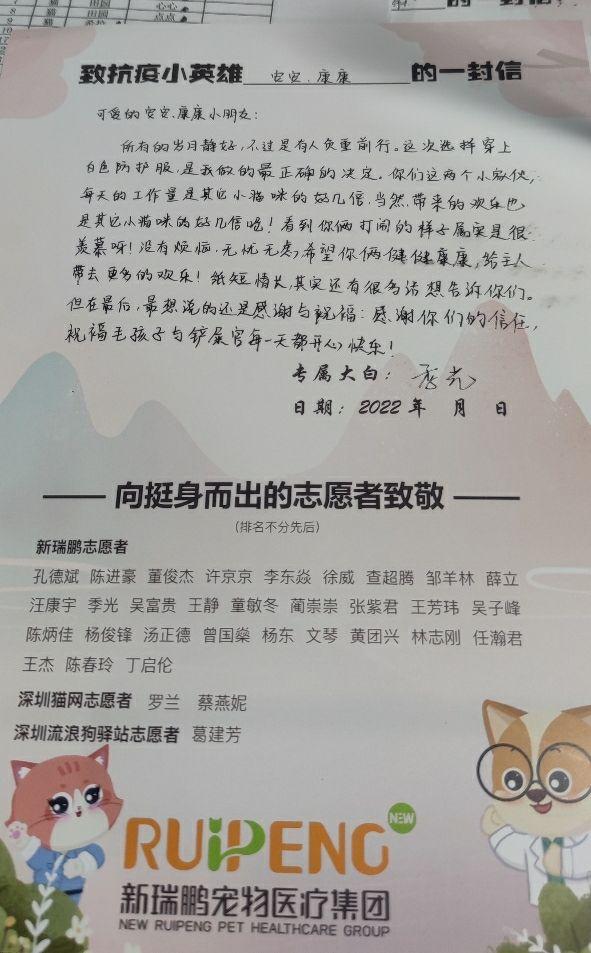 “可爱的安安、康康小朋友:所有的岁月静好,不过是有人负重前行。这次选择穿上白色防护服,是我做的最正确的决定。你们这两个小家伙,每天的工作量是其它小猫咪的好几倍,当然带来的欢乐也是其它小猫咪的好几倍······”宠物隔离结束后,它们获得了志愿者的手写信。