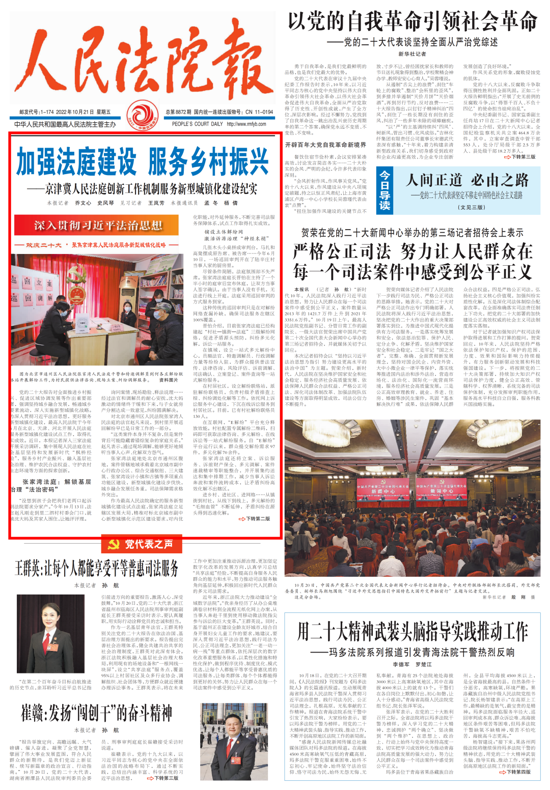 党的二十大报告对全面推进乡村振兴、促进区域协调发展等作出重要部署,强调坚持城乡融合发展,畅通城乡要素流动,深入实施新型城镇化战略。为深入贯彻习近平法治思想,更好服务新型城镇化建设,最高人民法院于今年5月在北京、天津、河北开展人民法庭服务新型城镇化建设试点工作,取得扎实成效。近日,本报记者深入三家法庭开展采访调研,集中展现人民法庭在社会基层坚持和发展新时代“枫桥经验”,服务乡村产业振兴、融入基层社会治理、维护农民合法权益、守护农村生态环境等方面的探索创新。张家湾法庭: