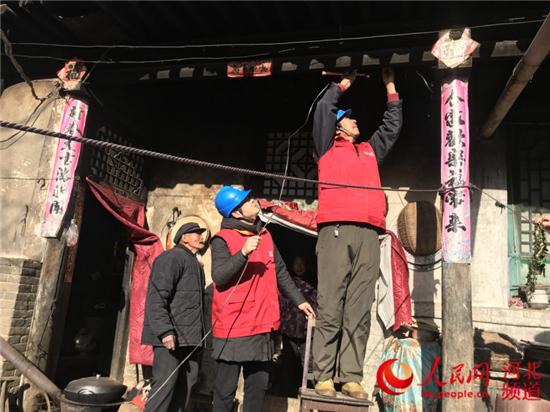 阜平供电公司共产党员服务队蔡晓阳、庞素科为解放前老党员陈业宏更换室内老化的电力线路,保障冬季安全用电。 郝成学摄