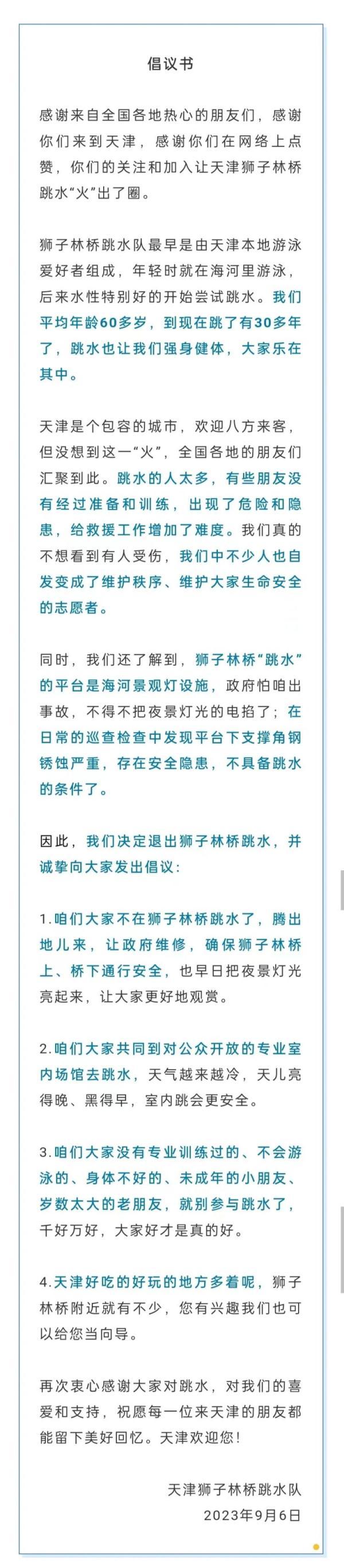天津狮子林桥跳水队发布的倡议书提到,狮子林桥跳水队平均年龄60多岁,已经跳了30多年,跳水让大家强身健体、乐在其中。但目前跳水的人太多,有些朋友没有经过准备和训练,出现了危险和隐患。呼吁没有经过专业训练的人员,不要参与跳水。