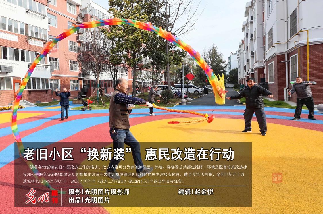 随着各地城镇老旧小区改造工作的推进,改造内容可分为建筑物屋面、外墙、楼梯等公共部位维修,环境及配套设施改造建设和公共服务设施配套建设及其智慧化改造三大类,最终建成现代社区居民生活服务体系。截至今年10月底,全国已新开工改造城镇老旧小区5.34万个,超过了2021年《政府工作报告》提出的5.3万个的全年目标任务。图为12月8日,江苏淮安市民在小区广场抖空竹。该小区借助老旧小区改造时机,在小区空地处铺设彩色透水混凝土、补植花本、增设健身器材、新增游乐设施,打造成特色"口袋公园",供居民休闲活动。(赵启瑞摄/光明图片)