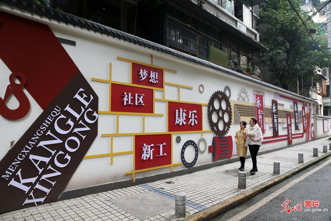 2021年12月3日,居民走在重庆市大渡口区九宫庙街道新工社区老旧小区改造的人行道围墙前。(杨敏摄/光明图片)