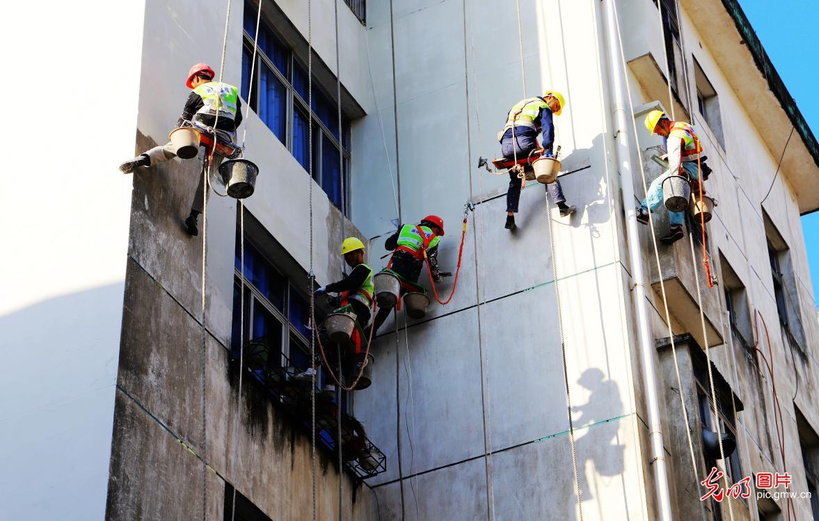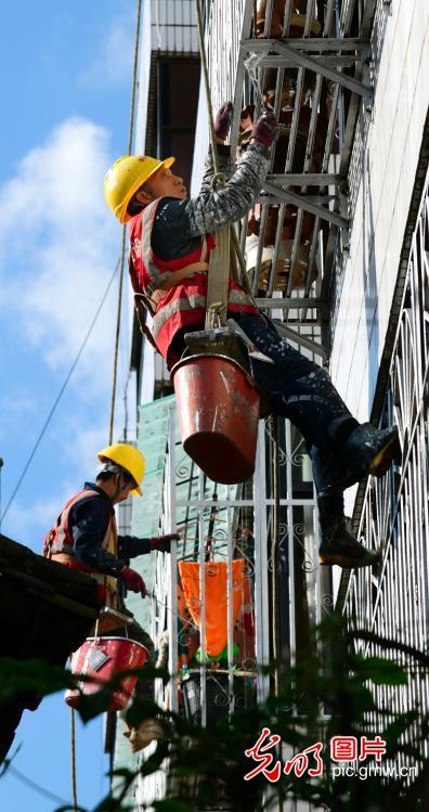 2021年11月18日,云南省红河哈尼族彝族自治州弥勒市城投公司工人在市民政局老旧小区刷漆"换新装"。(普佳勇摄/光明图片)