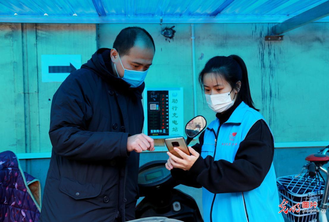 2021年11月25日,在河北省邯郸市磁县御景社区中行商住楼小区,社区工作者向社区居民介绍智能充电桩的使用方法。(赵飞飞摄/光明图片)