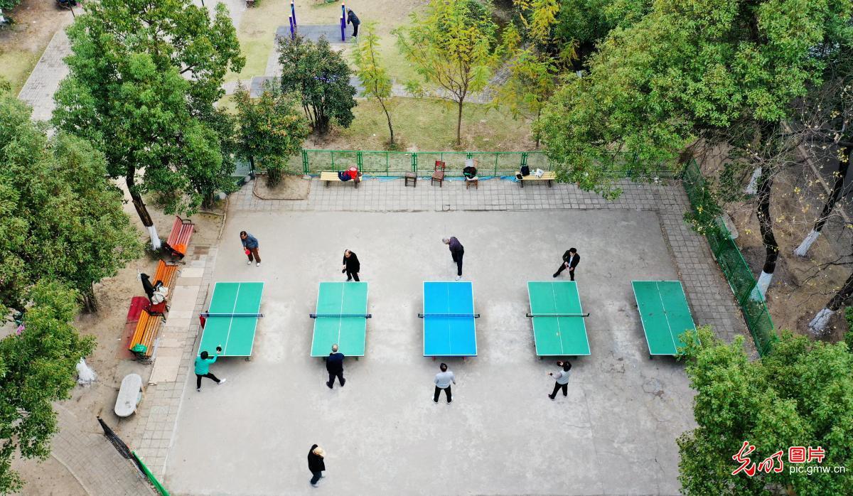 2021年11月29日,安徽省合肥市蜀山区琥珀街道琥珀山庄小区环境优美、景色宜人,居民在风景如画的小区公园里锻炼身体,尽情享受幸福生活。(陈三虎摄/光明图片)