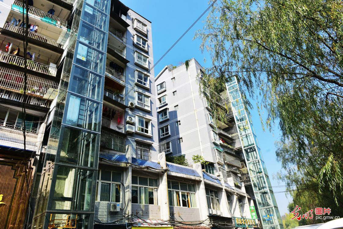 2021年12月5日,重庆市酉阳土家族苗族自治县桃源金水岸小区,刚刚安装投用的户外电梯。(邱洪斌摄/光明图片)