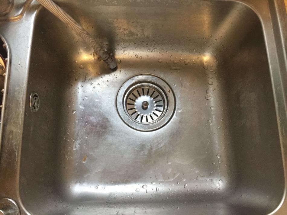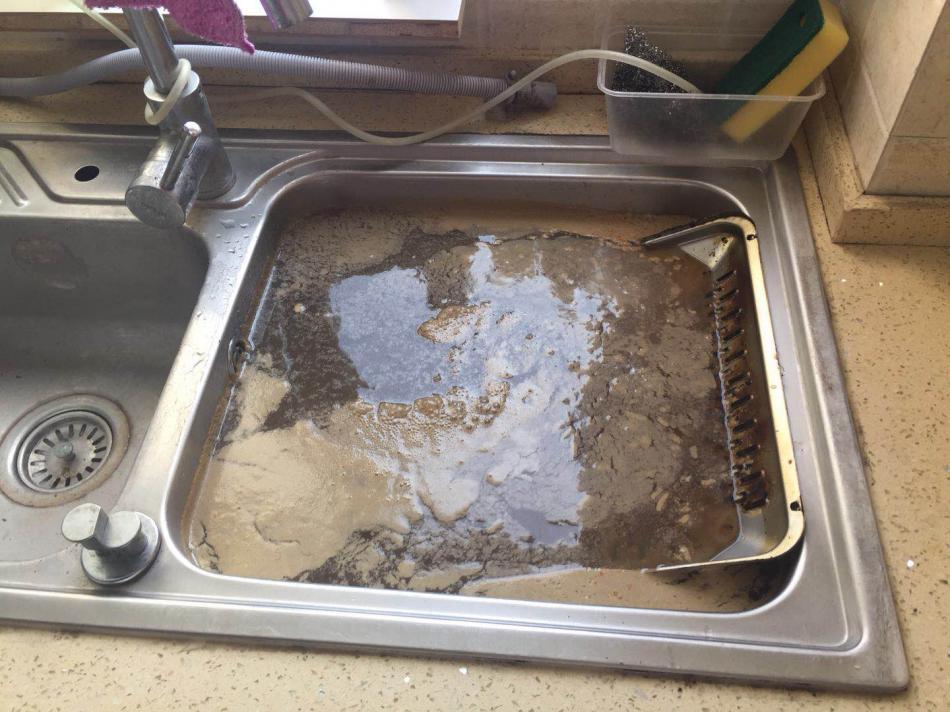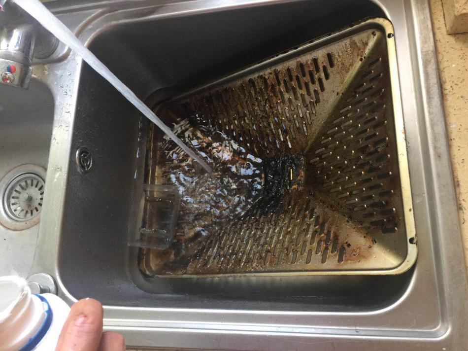再来看看泡在水槽里的网罩,水面上浮起了一层厚厚的油污,网罩上的油污都已经被化学药品清洁得干干净净,光可鉴人,连同泡着水的水槽,放光了水之后,下面的提篮都一并清洁得非常干净。