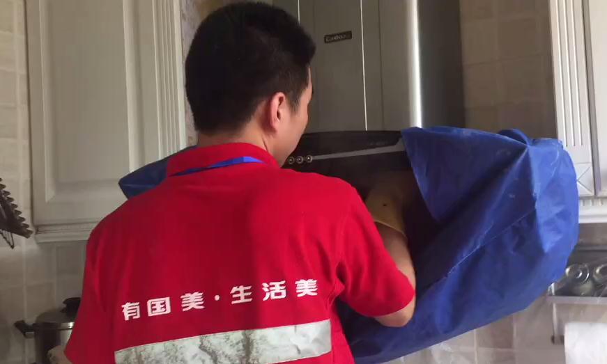 约定的上门时间是周日的上午9:00,还没梳洗毕,国美管家的工程师就来敲门了。小伙子长得挺精神,一进门礼貌地介绍了自己的姓名和工作单位,并向我展示了国美管家的工作证。然后从包里拿出一块布在客厅铺开,摆上清洗油烟机的各种工具,然后协助我收拾厨房台面上的各种杂物。