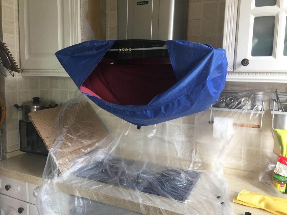 然后他又拿出一个蓝色布牢牢包住油烟机,蓝色布中间有个孔可以将滴下的油污排放掉。这里面黑呼呼的,工程师是怎么清洗的呢?我们拭目以待。
