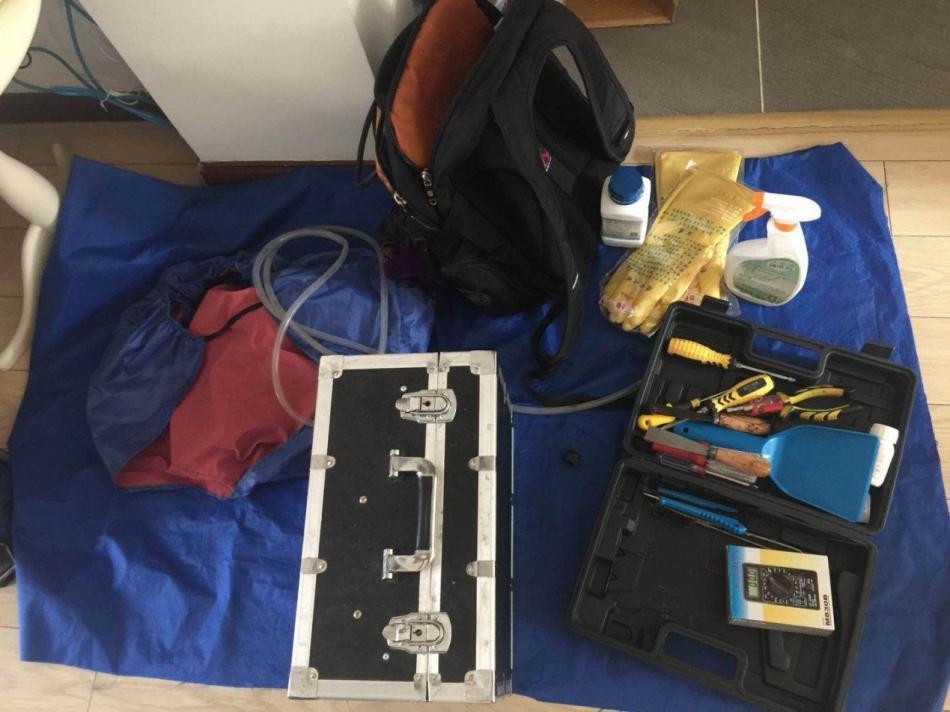 工程师带上橡胶手套,从满地的工具里拿出一个方方正正的工具箱,就是那个黑白相间,带锁的工具箱。打开来,里面有一个手持喷嘴,一根长长的透明管子,一个小小的可以吸水的机器。