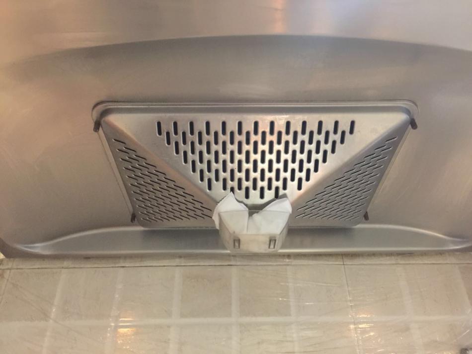 收拾完台面,工程师拿出两片一次性塑料桌布,包裹住油烟机下面的区域,以防止在清洗过程中有油污滴下。然后拧下网罩的四个螺丝,把网罩拆下来,放在洗碗水槽里,放入他带来的专门去除重油污的清洁液,加入热水泡着。看着网罩背面的油污,真的惨不忍睹,幸好有国美管家,如果自己来弄,想想就可怕。