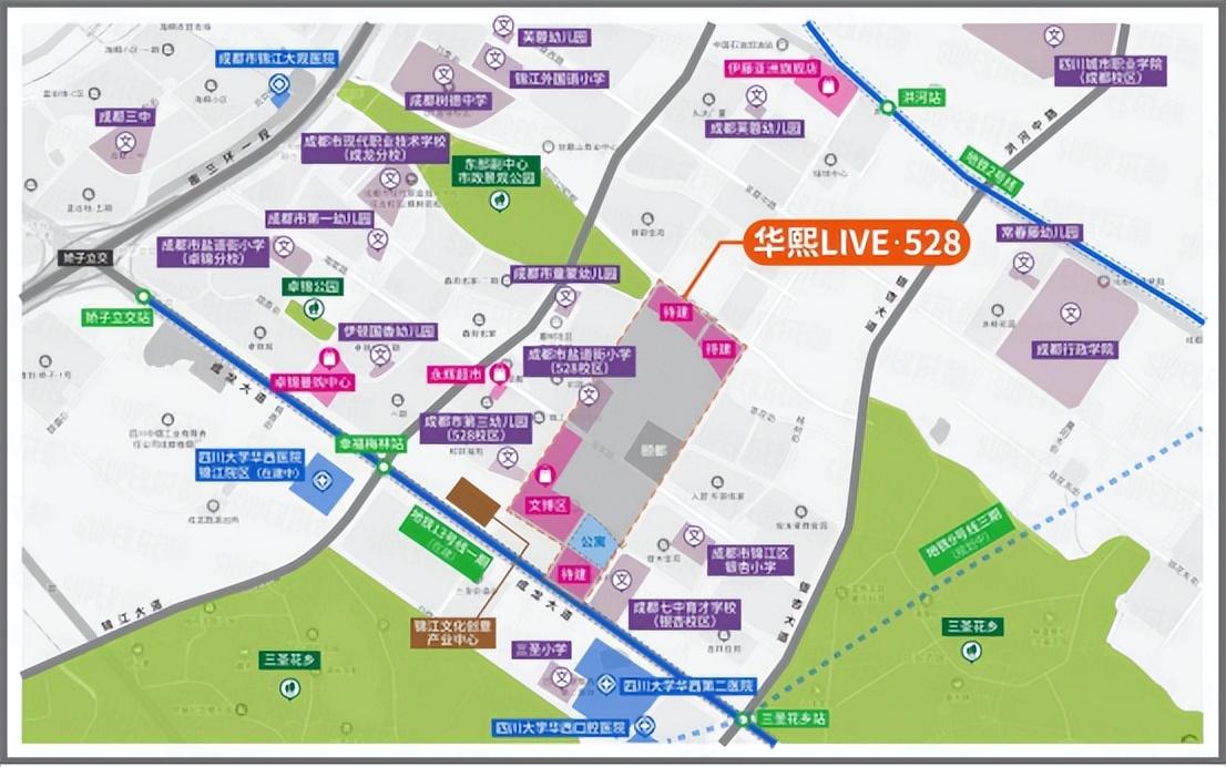 在教育方面,近20所学校,覆盖了从幼儿园到高中的教育阶段,其中更不乏名校,成都五朵金花之一的盐道街小学、树德中学(九中)和七中育才都在片区里设有分校。能在这小小片区里就聚集到众多优质教育资源,片区内一众地产项目出力不少。其中,华熙LIVE·528项目凭一己之力,就为片区引入了盐道街小学(528校区)和成都市第三幼儿园(528校区)这两所知名公立学校。