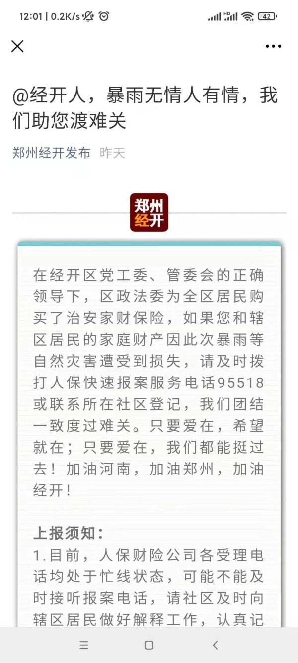 在经开区党工委、管委会的领导下,区政法委为全区居民购买了治安家财保险,如果您和辖区居民的家庭财产因此次暴雨等自然灾害遭受到损失,请及时拨打人保快速报案服务电话95518或联系所在社区登记。