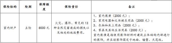 家财综合险、家财盗抢、家用电器用电安全、管道破裂及水渍、意外身故、残疾给付、电动自行车盗抢保险,另外因为火灾爆炸、雷击、台风、龙卷风、暴雨、洪水、崩塌、地面突然下陷、燃气泄漏、校园暴力伤害等,产生的人身安全问题。