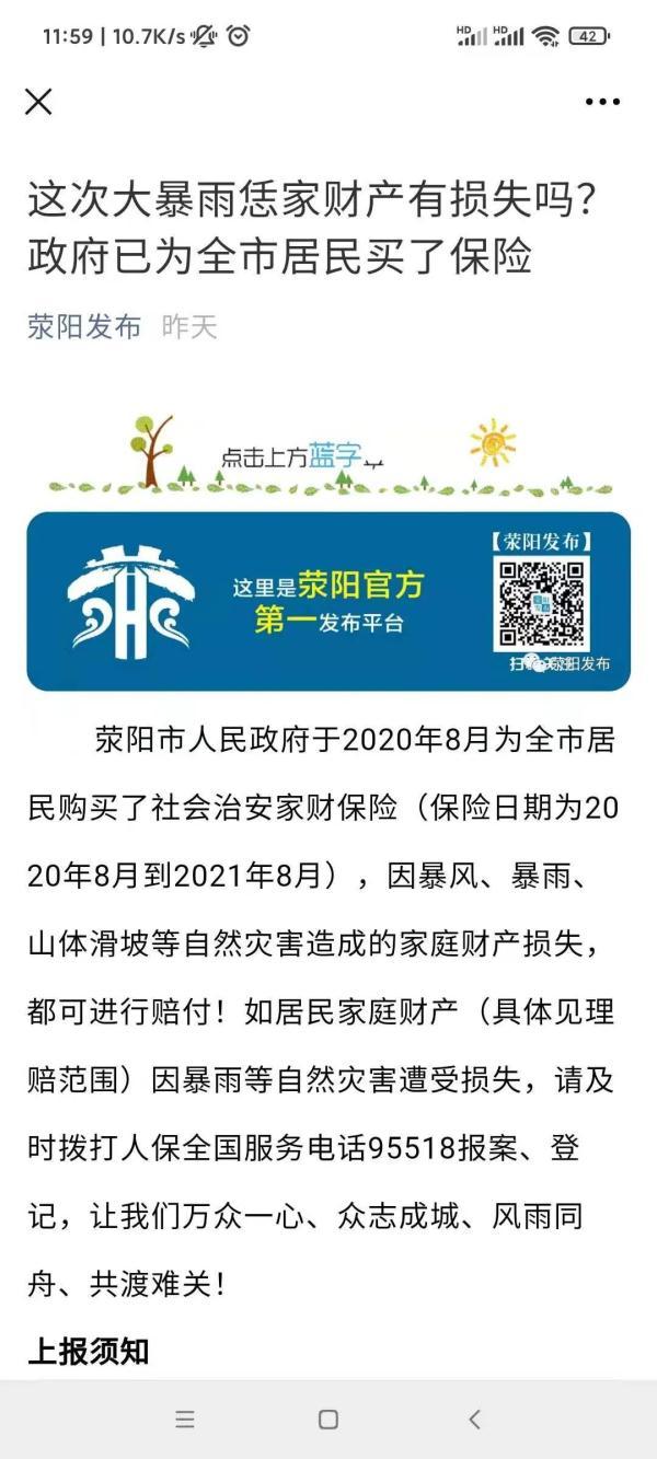 荥阳市人民政府于2020年8月为全市居民购买了社会治安家财保险(保险日期为2020年8月到2021年8月),因暴风、暴雨、山体滑坡等自然灾害造成的家庭财产损失,都可进行赔付!如居民家庭财产(具体见理赔范围)因暴雨等自然灾害遭受损失,请及时拨打人保全国服务电话95518报案、登记。