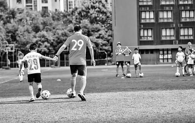成都某小学足球课上,学生和父亲进行“携手带球前进”练习。新华社发