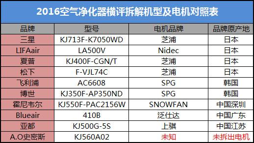 经过5个多小时的拆解,10台净化器终于第一次在镜头面前露出了自己的“内芯”,这其中有如日本芝浦、韩国SPG等知名顶级电机,也有不算太有名的国产电机,具体机型及电机对应见下表: