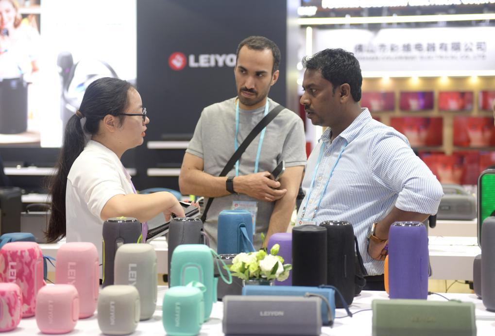 10月15日,客商在广交会展馆内参观选购音箱。新华社记者卢汉欣 摄