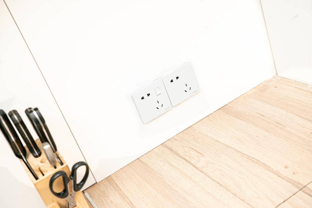 ▼电路的部分也全部更换,走线采用了明线槽,都在橱柜踢脚线的后部,并不会看到。开关面板也全部换新,使用了立维腾的一开斜五孔,对比以前家里用的大翘板,发现小钮的开关要更实用。
