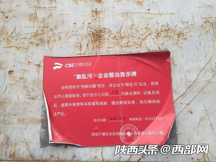 12月28日,西部网记者来到了位于咸宁东路的西安照明电器工业公司。厂区大门上贴着一则落款为西安浐灞生态区铁腕治霾工作领导小组办公室的整改公告,公告称,按照西安“铁腕治霾”规定,该企业为“散乱污”企业,将依法予以清理取缔。须于告示之日起5日内搬走原料、设备及成品,逾期未搬离将采取强制措施,擅自撕毁封条、告示牌将依法严处。记者注意到,告示的落款时间是今年的7月30日。