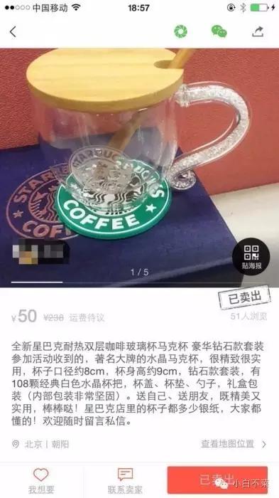 杨姐我用微信账号登录了一下“转转”,现在有260个好友在上面“卖货”,随手翻了翻,还真让我“惊喜”了一把。看,有个好漂酿的星巴克水晶杯子,才卖50元,可惜被抢走了: