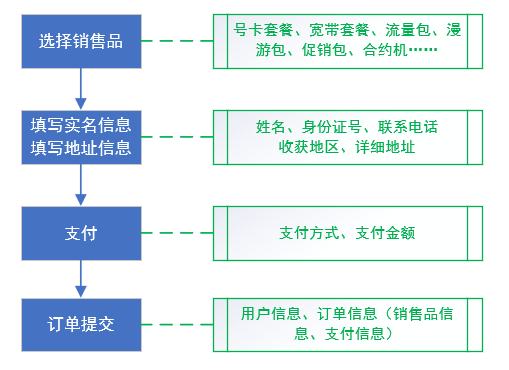 用户信息提交后,会落到商城后台,那么都有哪些用户数据呢?除了上面用户填写的个人信息外,和订单一起提交的还有商品信息(主要包括组成销售品的产品种类及数量)销售品包含哪些元素?