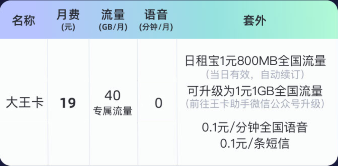 比如说我们常用的大王卡,流量卡,对用户而言就是一张手机卡,但我们可以拆开看一下,它都有哪些组成部分。以大王卡为例,实体卡是一个产品,你必须选择一个号码才能正常使用,这个号码也是一个产品,再来看一下套餐内的产品:我们可以看到专属流量40GB,这个流量在运营商系统里就是一个独立的产品:流量包,语音0分钟,就是这个销售品内不包含语音包。
