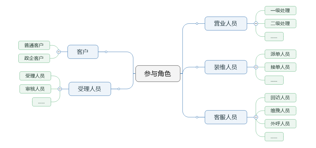 用户在和系统交互的过程中产生的数据为基础数据,包括用户个人信息、产品信息、交易信息,但是在订单流转过程中还会加入其他的数据,比如,手机卡寄出之后,会产生物流信息,物流信息中又会包含快递小哥的信息……首先要明确的是,在一个订单从开始到结束的过程中,有哪些角色参与了这一过程,以下是运营商的部分角色信息