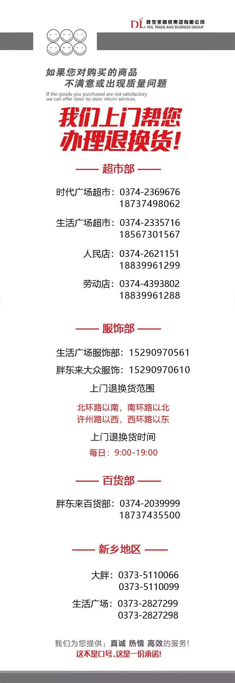 30日,许昌胖东来商贸集团有限公司通过官方网站、官方微信发出消息称:“如果您对购买的商品不满意或出现质量问题,我们上门帮您办理退换货! ”随消息一起公布的还有胖东来许昌市区及新乡市各大商超的退换货联系电话,联系电话中除了固定电话外,还公布了一个移动电话号码。