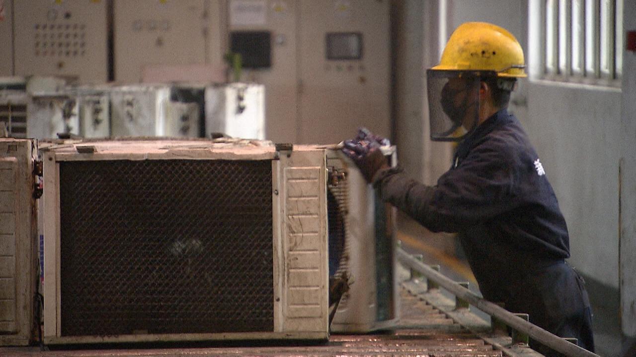 记者找到了位于上海浦东的新金桥环保有限公司,这家公司是一个家电拆解持证企业。下午1点,一辆装有三百多台旧空调的卡车正缓缓驶入厂内的装卸区。装卸下来的空调、洗衣机等会经过上料系统,被送上综合拆解线。拆解下来的金属和塑料,会被送到下游企业进行进一步的处理。比如,金属送到相应的冶炼厂,塑料进入到塑料的造粒场进行一个再生原材料,再进行使用。